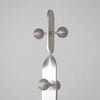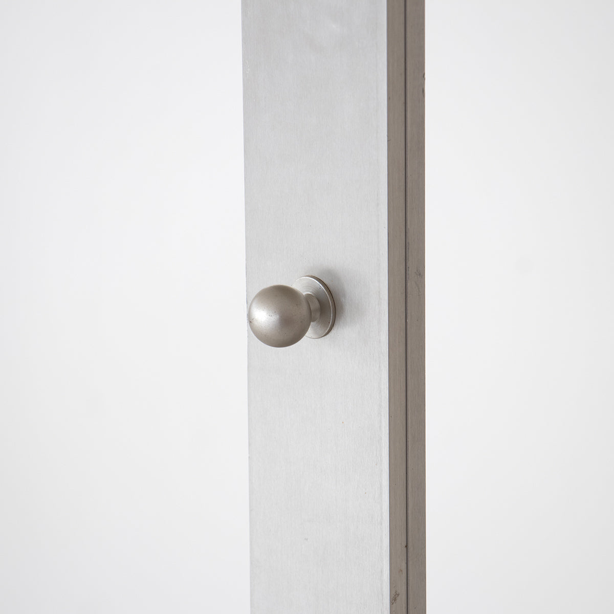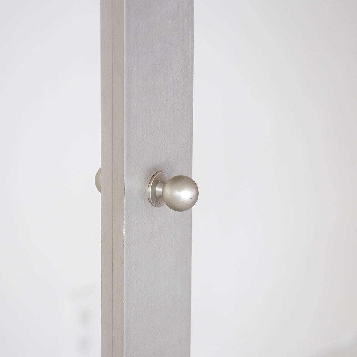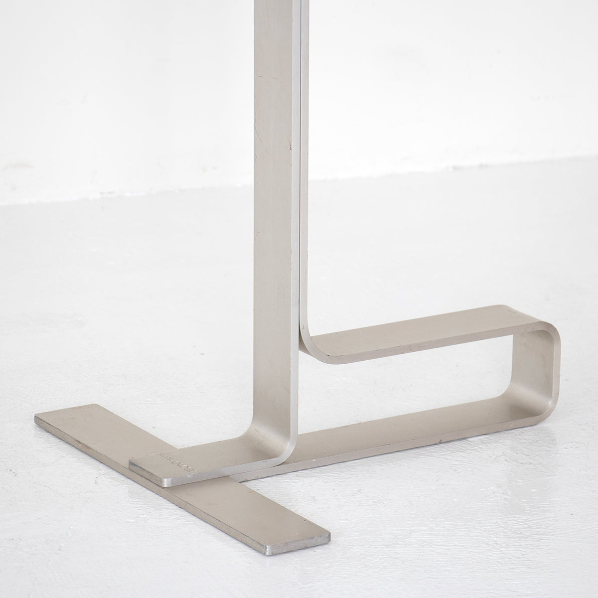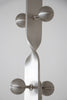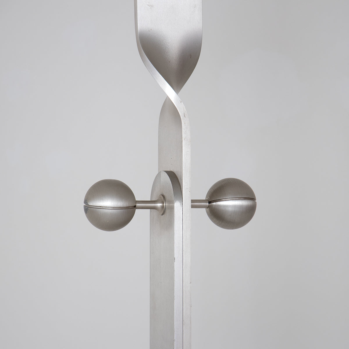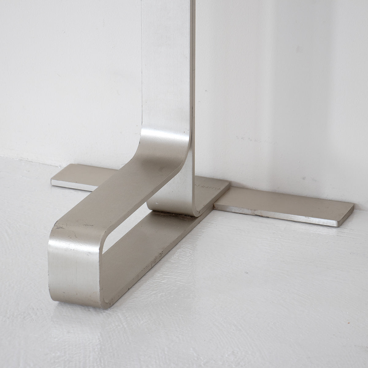 ヘアライン仕上げの金属フレームと支柱に施された緩やかなツイストが特徴的。