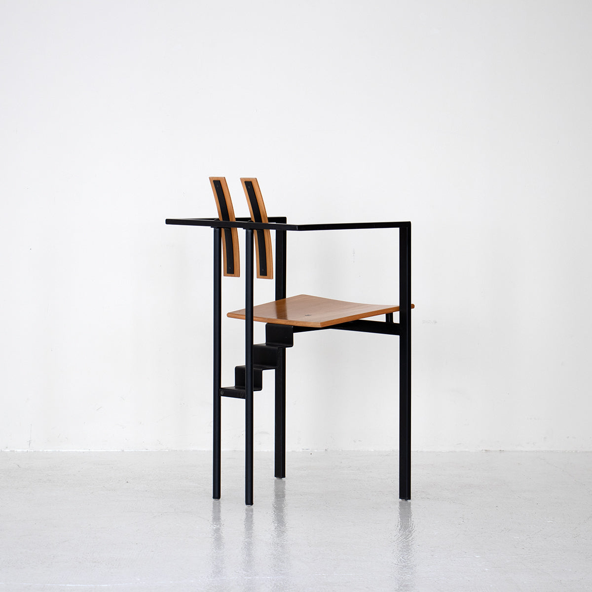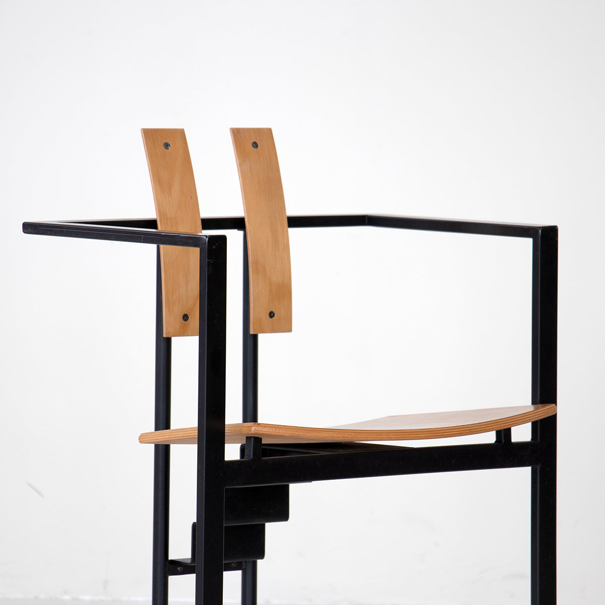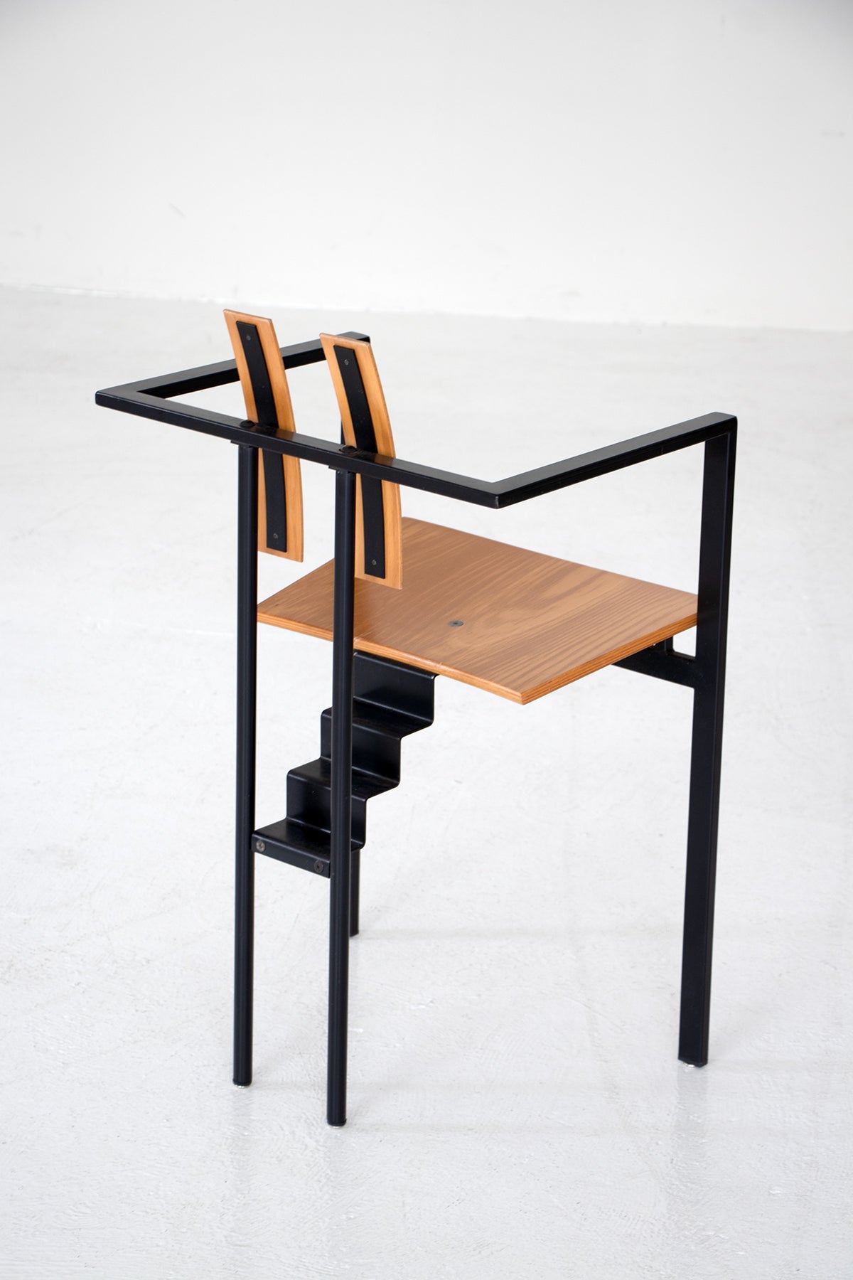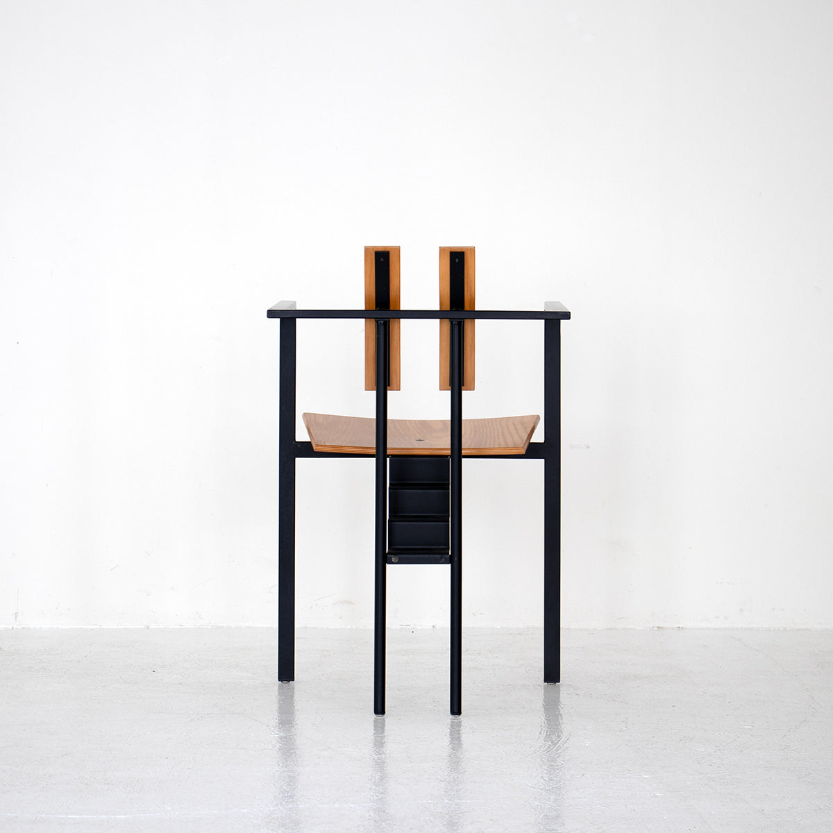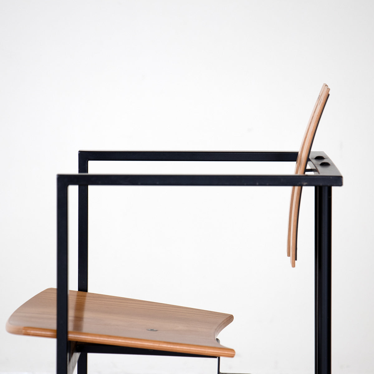 ブラックスチールのフレームと成形プライウッドを組み合わせた、幾何学的な構成を取り入れた一脚。