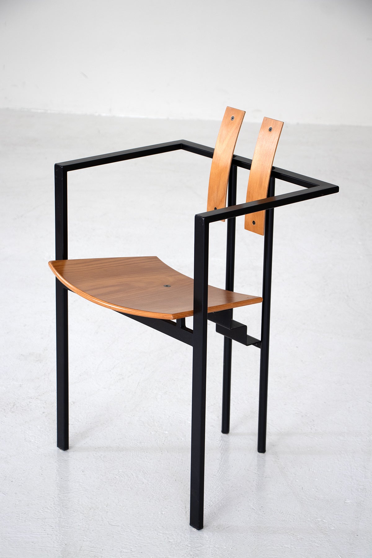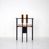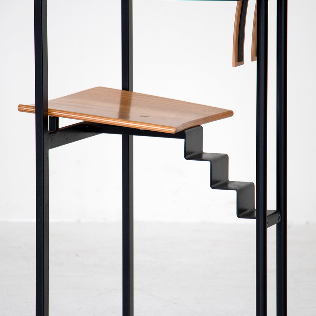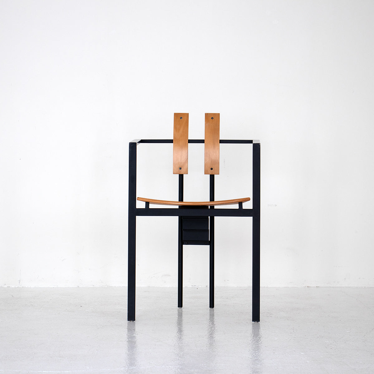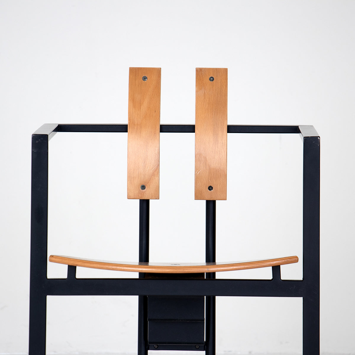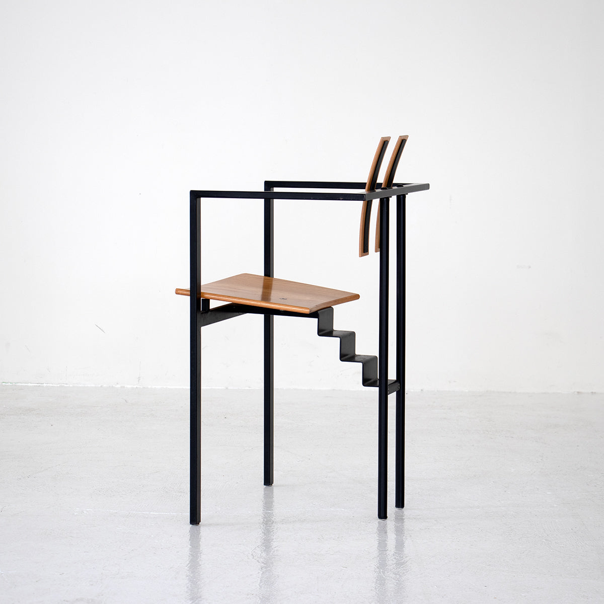 ブラックスチールのフレームと成形プライウッドを組み合わせた、幾何学的な構成を取り入れた一脚。