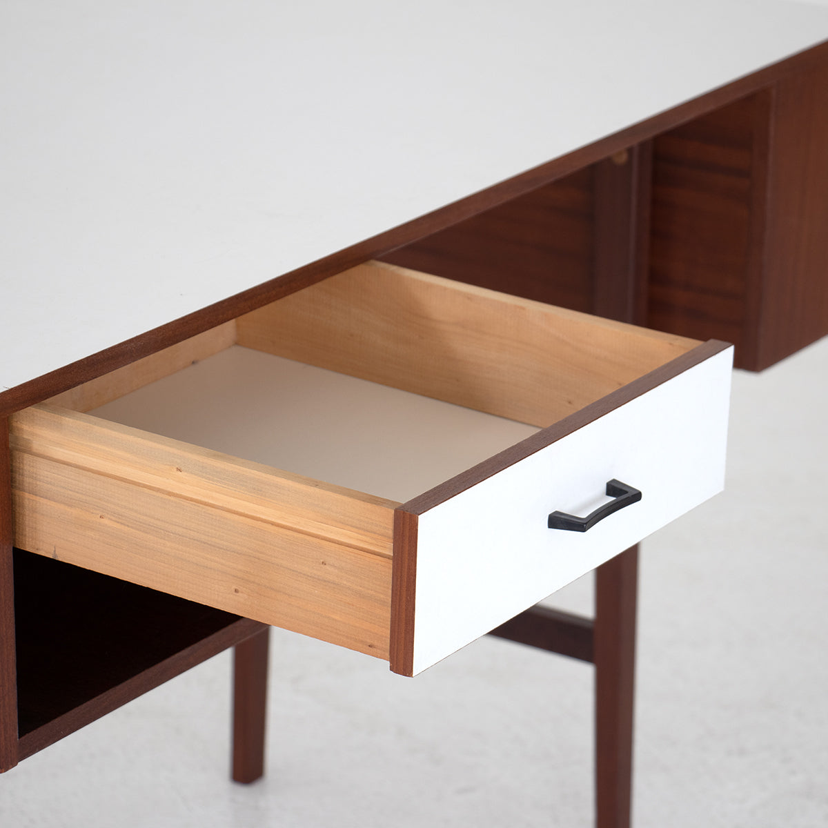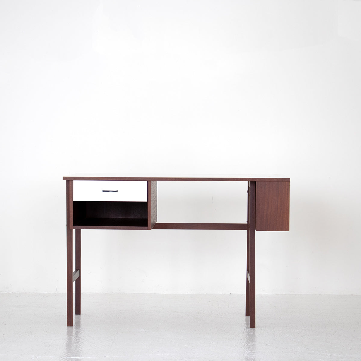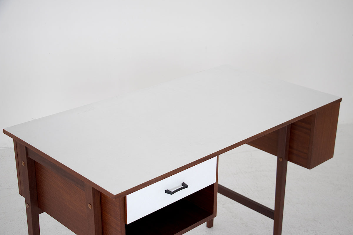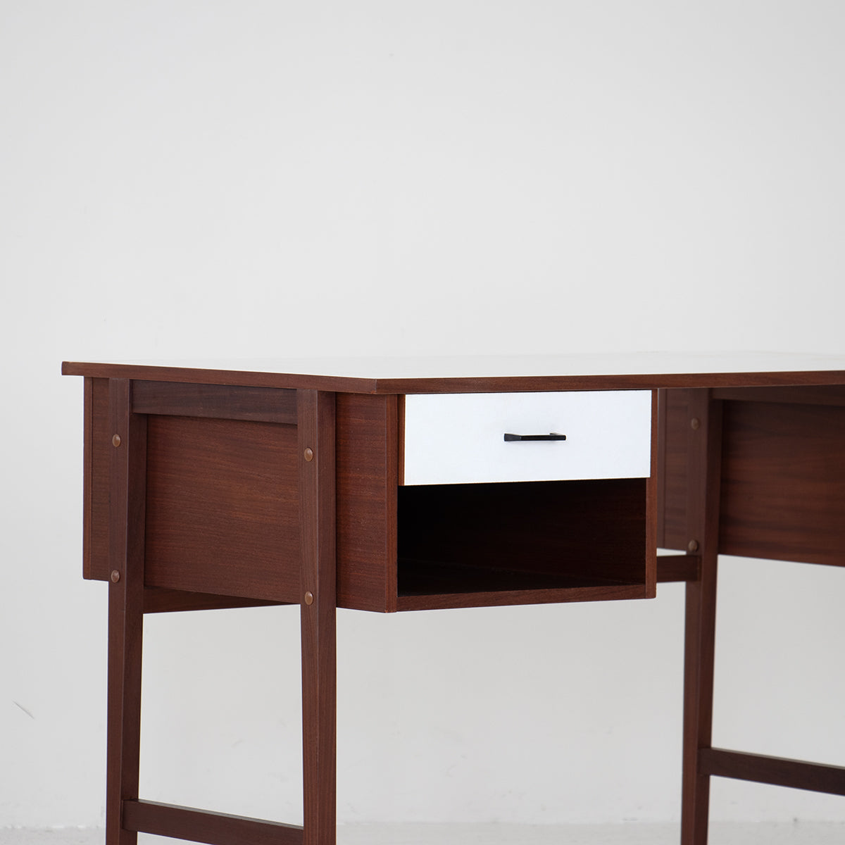 チーク材に白のメラミン天板と抽斗がアクセントになったデザインが特徴のデスクです。