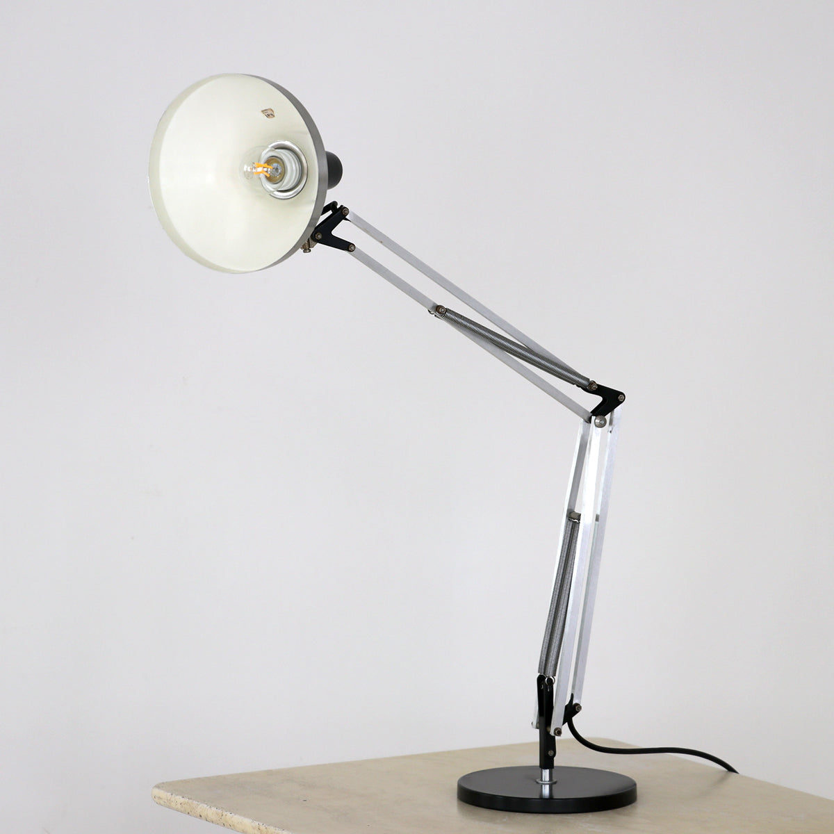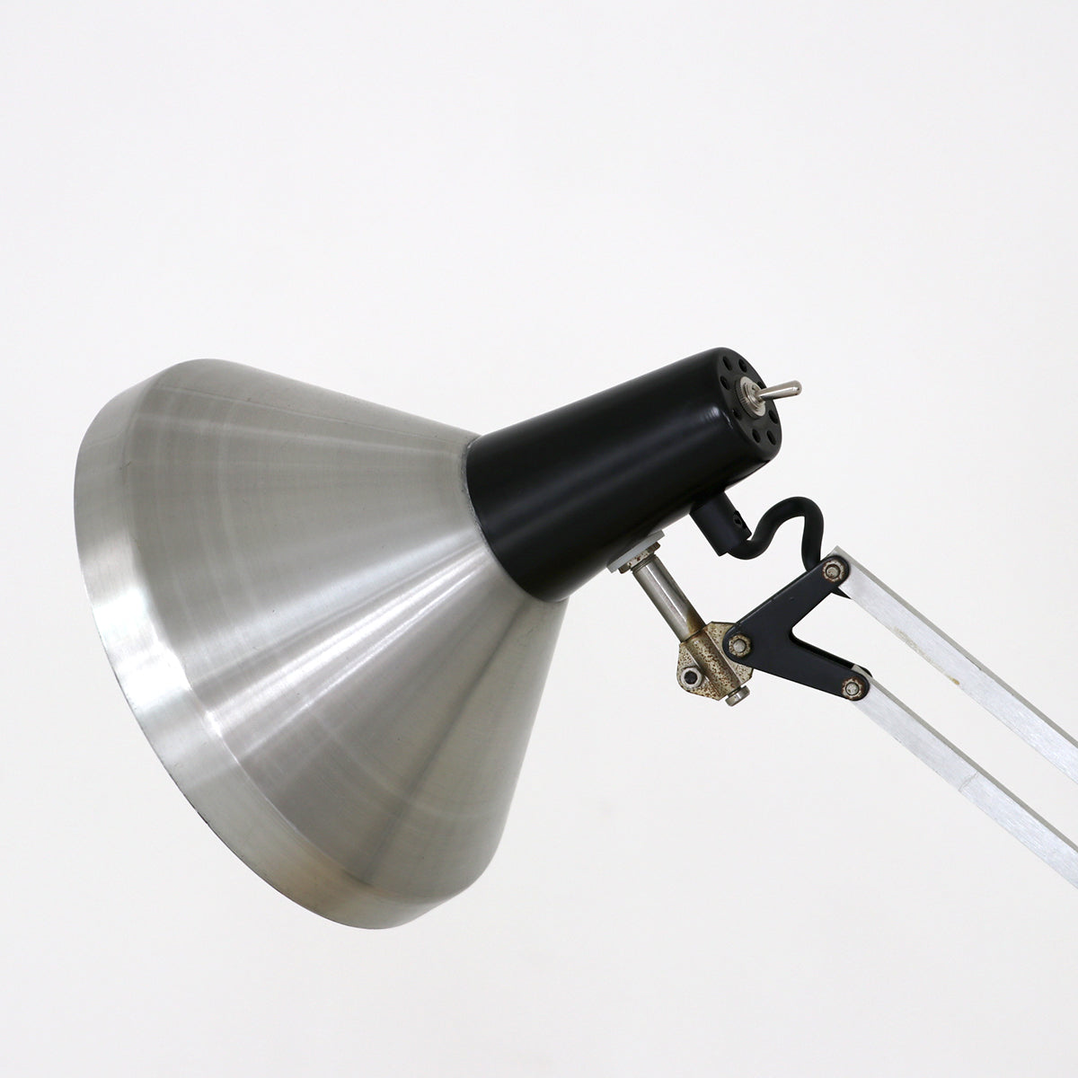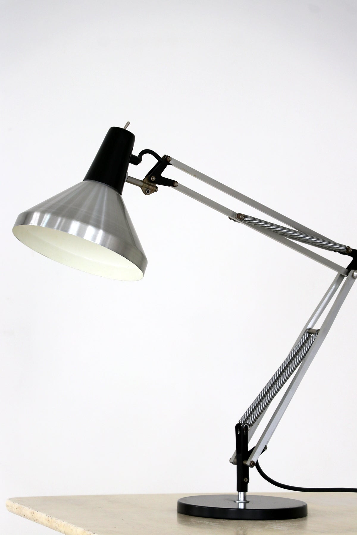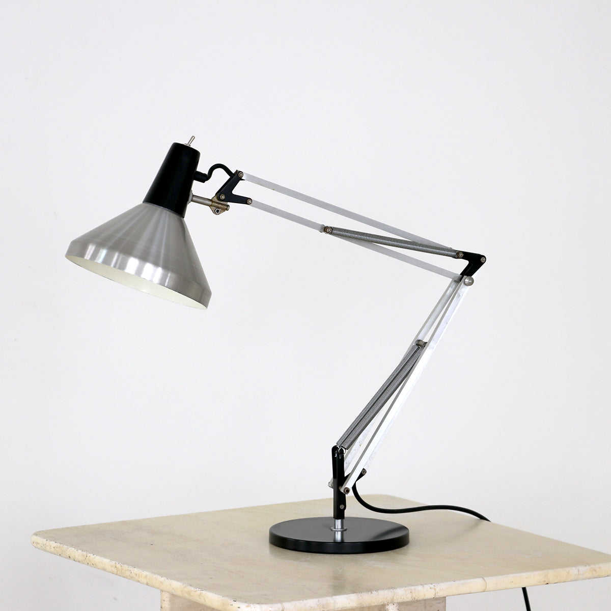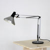シルバーとブラックのツートーンカラーのクールな佇まいで、イギリスのアングルポイズのような自由度の高い角度調節が可能な実用的なランプ。