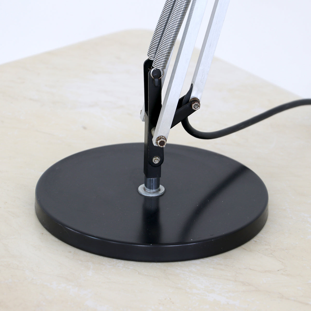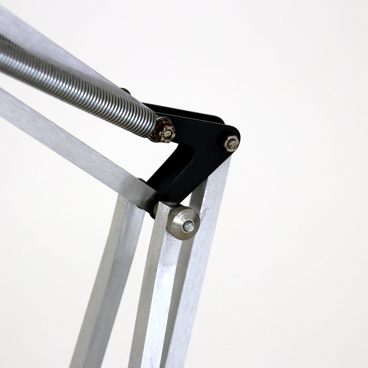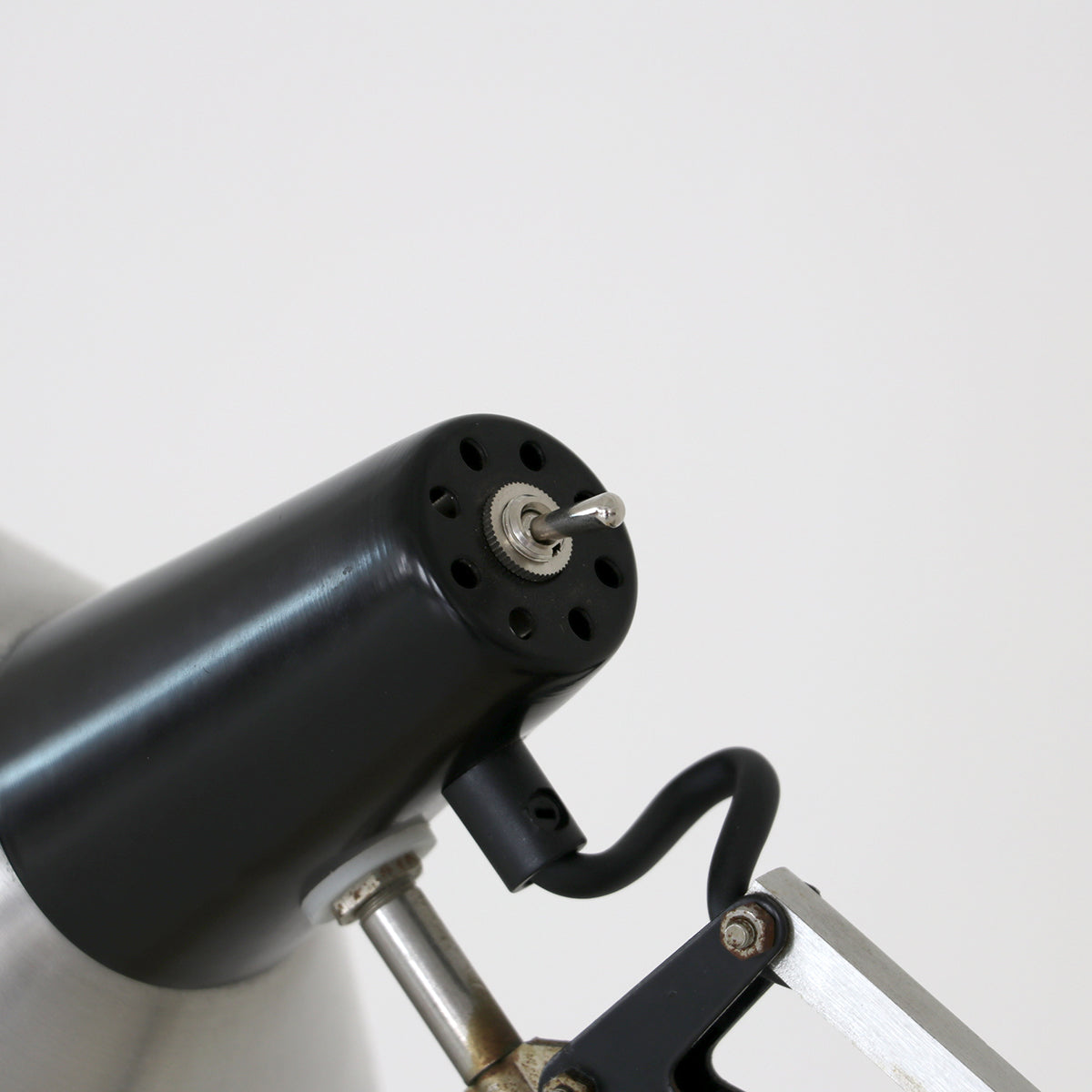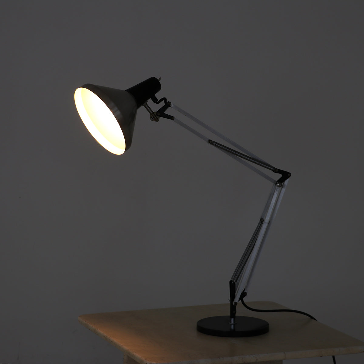 シルバーとブラックのツートーンカラーのクールな佇まいで、イギリスのアングルポイズのような自由度の高い角度調節が可能な実用的なランプ。