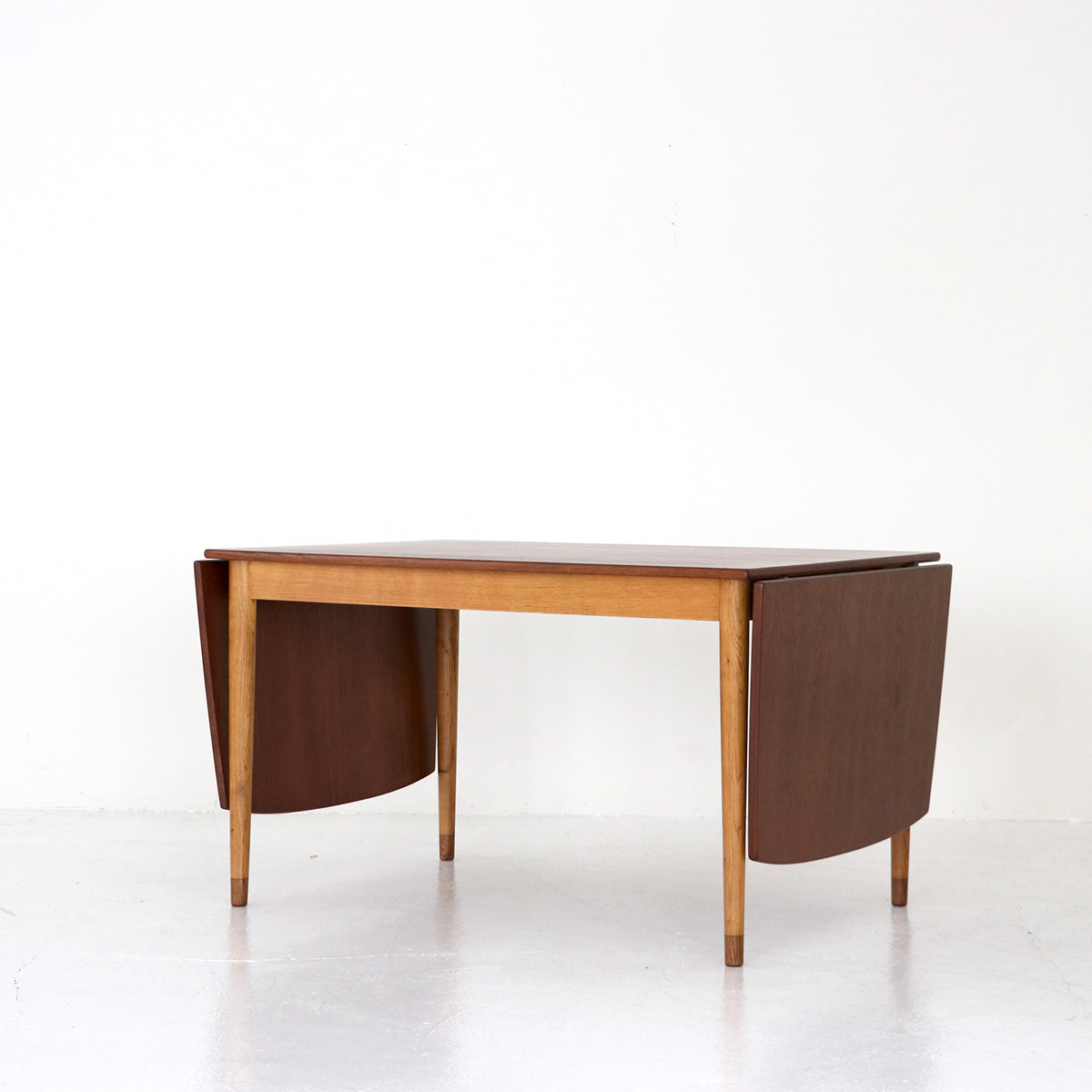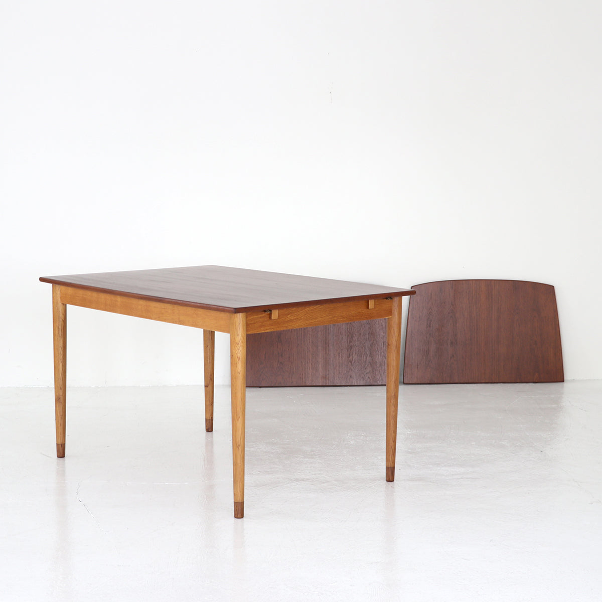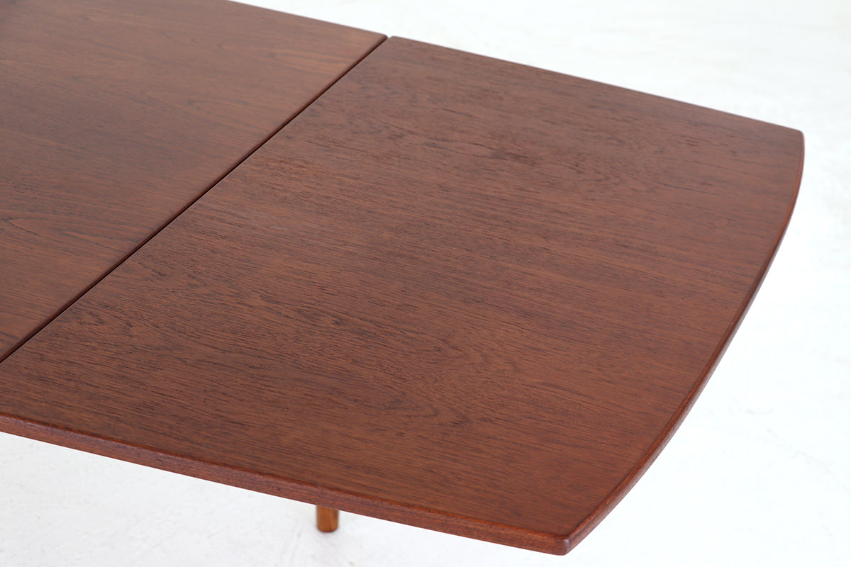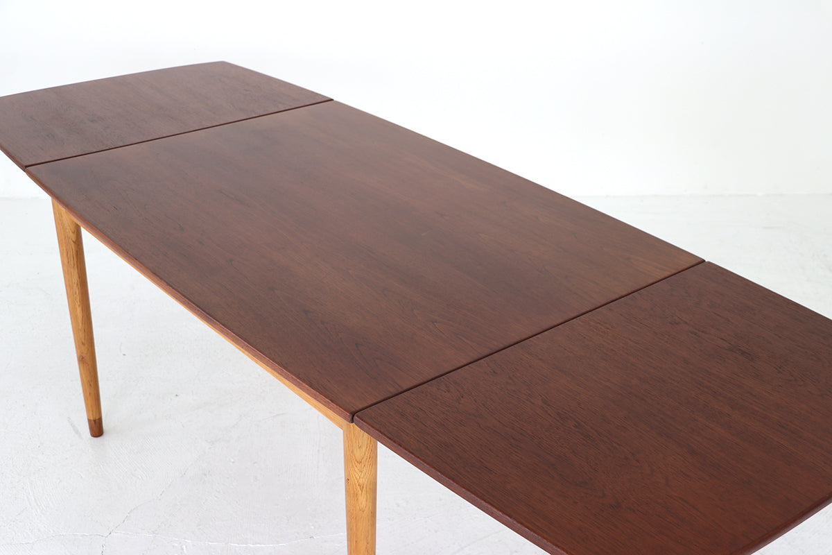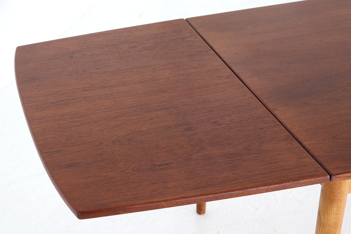 チーク材を使用した天板は緩い弧を描いたボートシェイプ型。脚は明るい色味のオーク材で脚先は天板のチーク材に合わせて着色されており、デザインのポイントにもなっています。