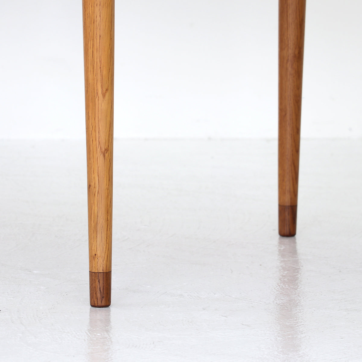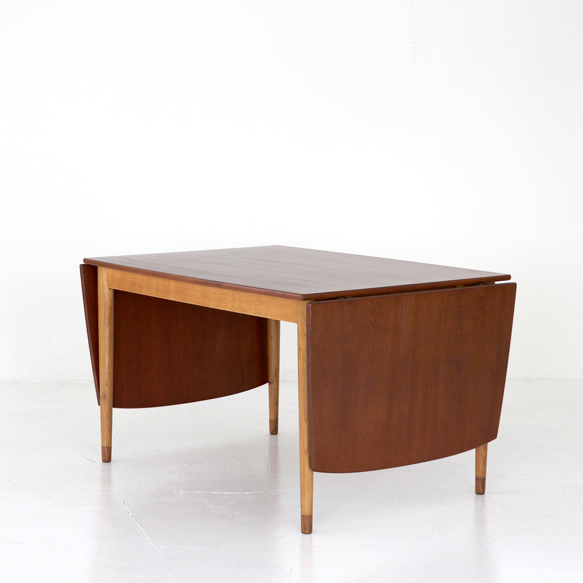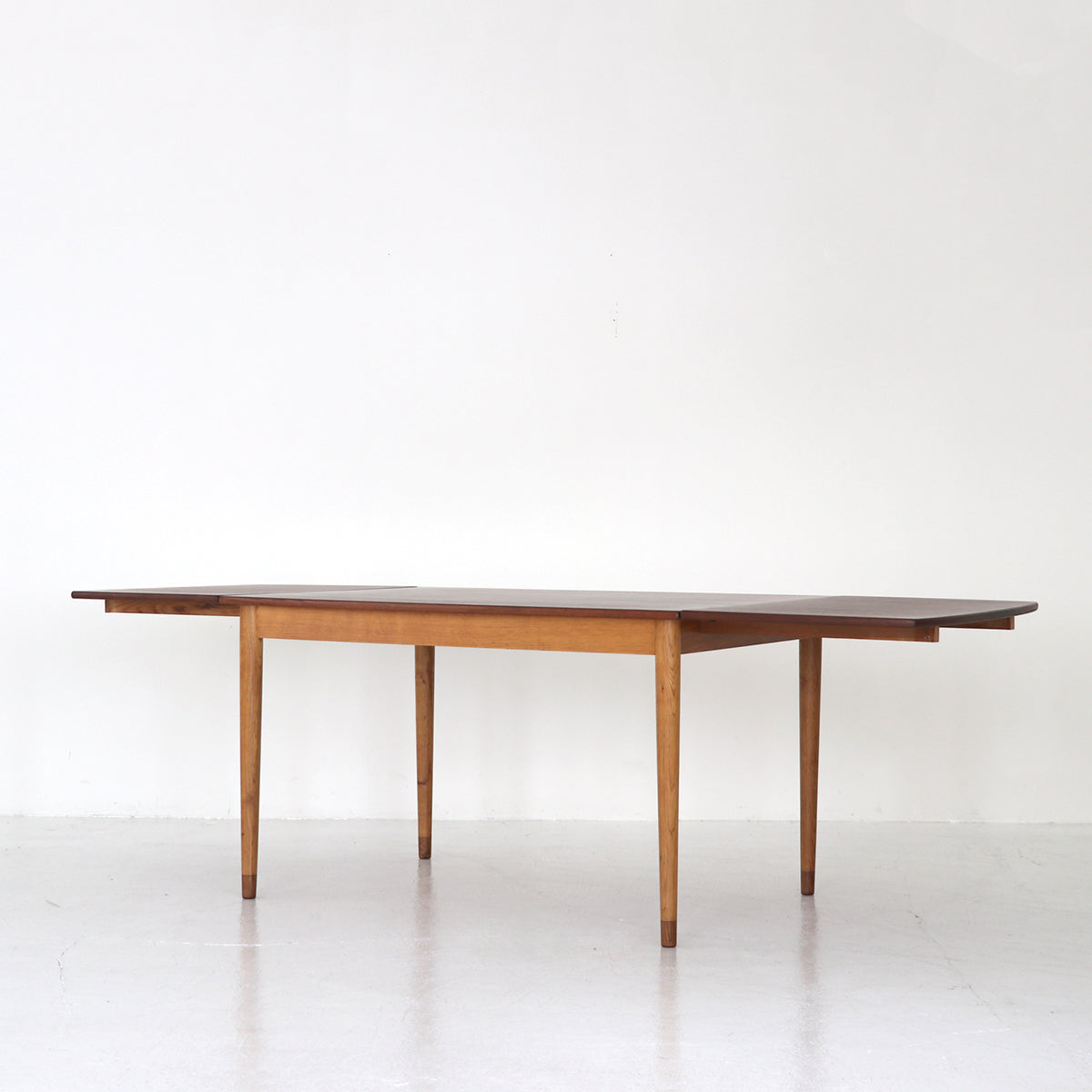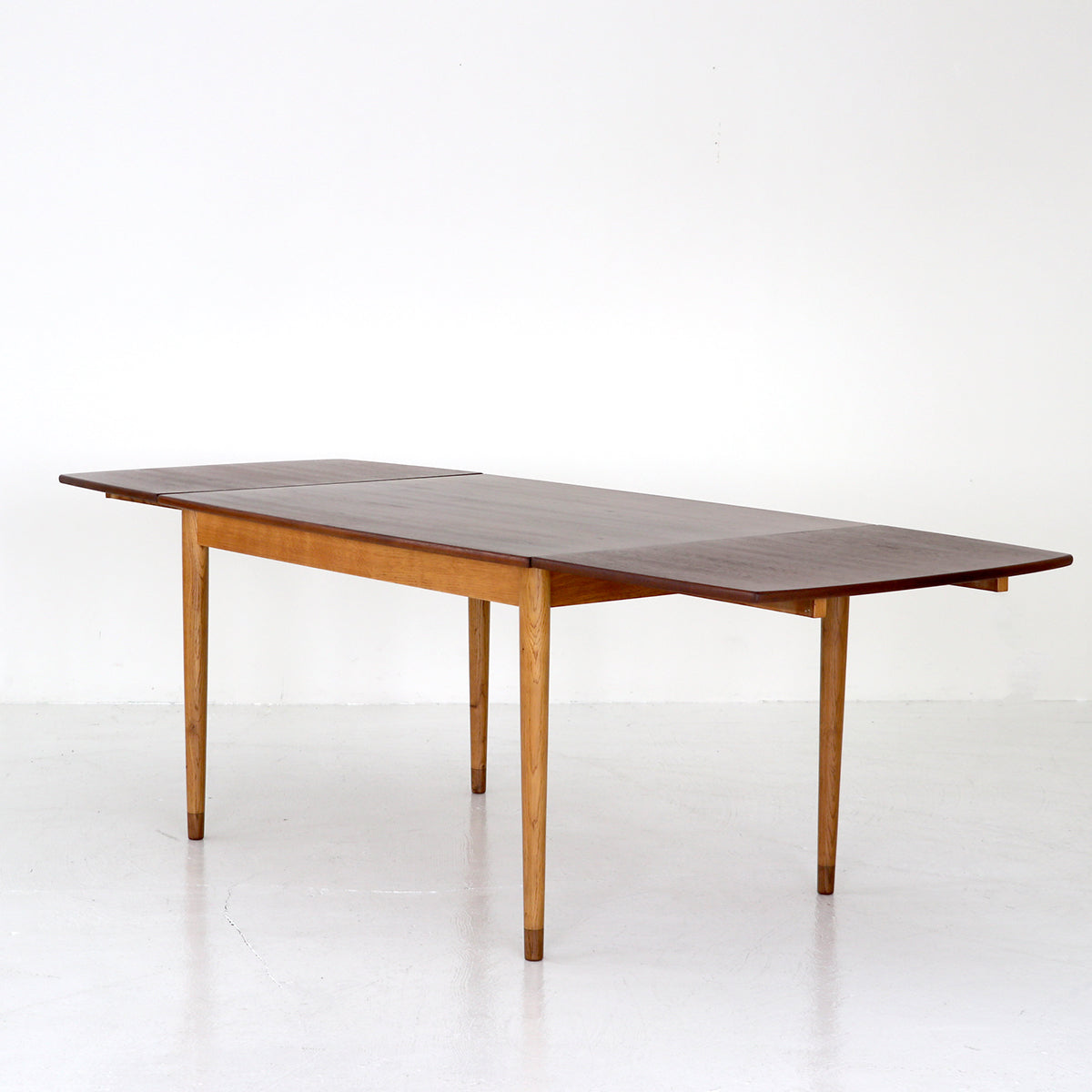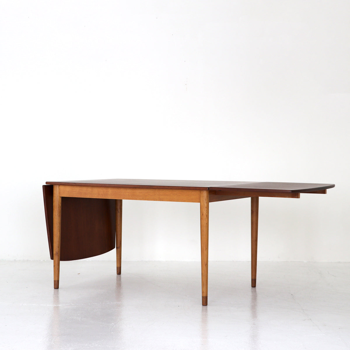 チーク材を使用した天板は緩い弧を描いたボートシェイプ型。脚は明るい色味のオーク材で脚先は天板のチーク材に合わせて着色されており、デザインのポイントにもなっています。
